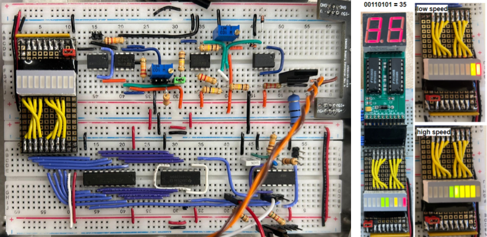 Here’s the circuit built and powered (motor not shown), and the LED bar indicates the speed.