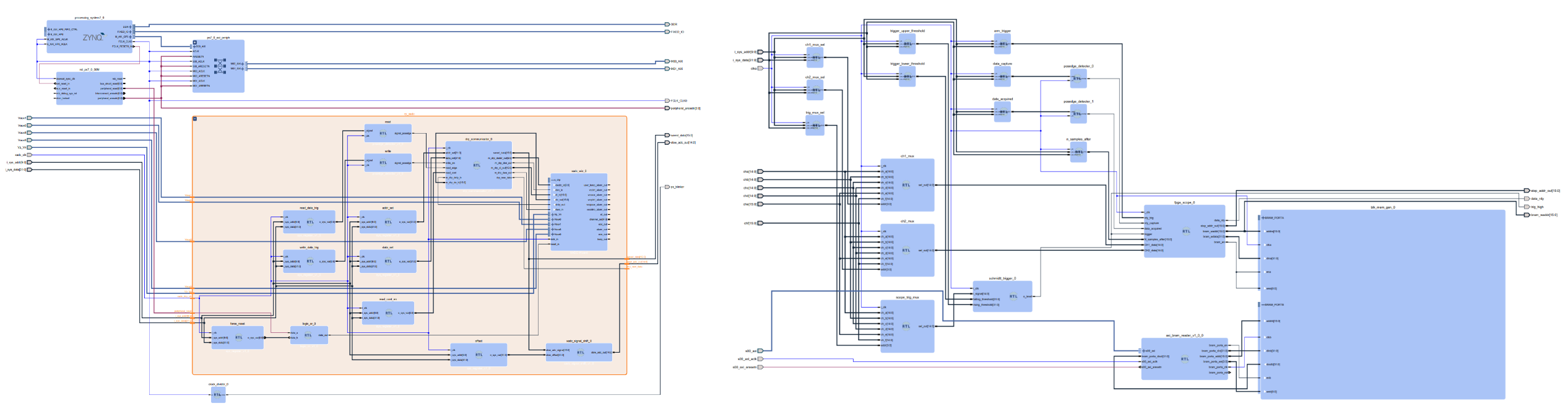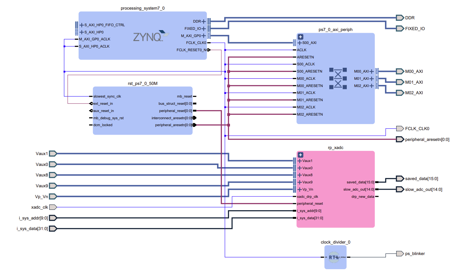 Here’s the block design of our processing system and XADC core, which interfaces with the Zynq 7010’s internal slower ADC running at 1 MSP/s…