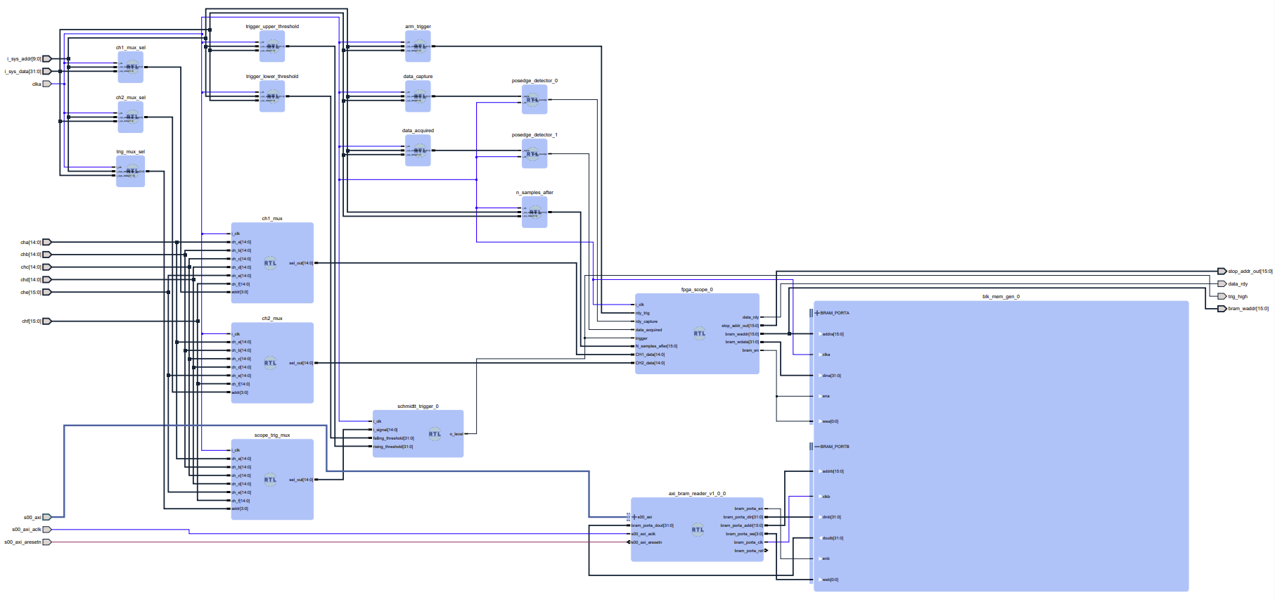 Here’s the FPGA scope, which uses a dual-port BRAM to write trace data from the FPGA fpga_scope.v, and is read by an axi_bram_reader for the CPU-side to access from.