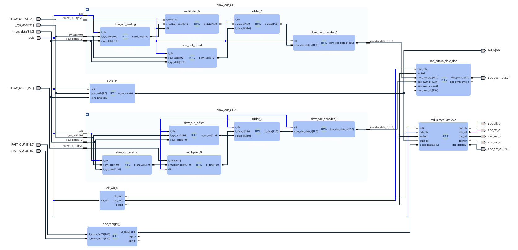 Here’s the output scaling bit-manipulating blocks used to output to the slow PWM DAC outputs (100 KSP/s) and the fast DAC outputs (125 MSP/s):