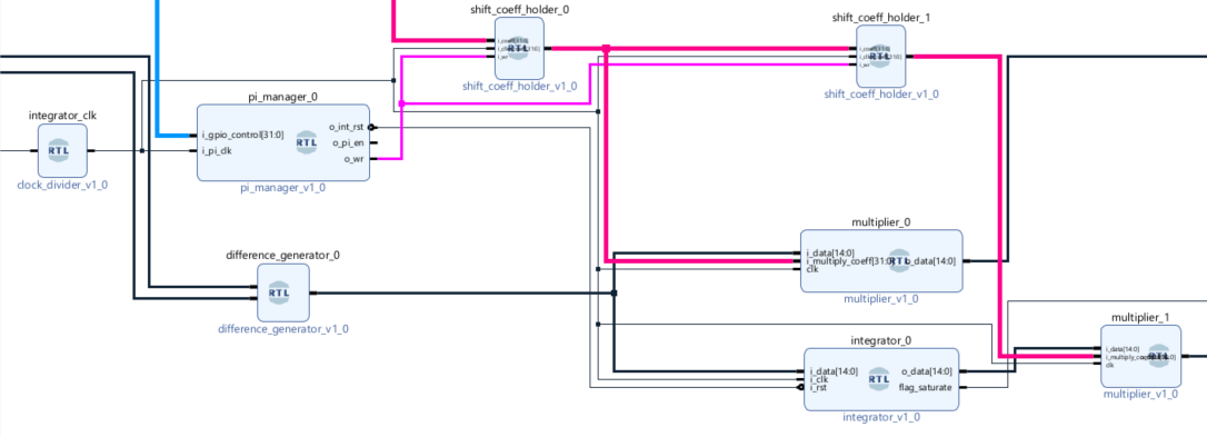 To get more acquainted with the FPGA and it’s DSP and analog IO capabilities, one “mini project” we set out to complete was to replace the difference amplifier with an FPGA PID controller. I put together the proportional and integrator blocks: