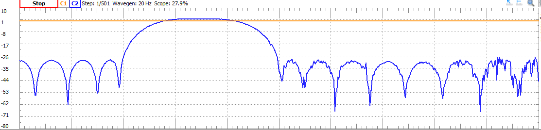 They ended up working really nicely for our purposes — here’s an example of a bandpass filter with 31 taps, with a maximum bandwidth of ~100 kHz. The left is the theoretical response plotted by a MATLAB tool (available in FIR development post), and the right is the experimental response. They’re essentially identical!